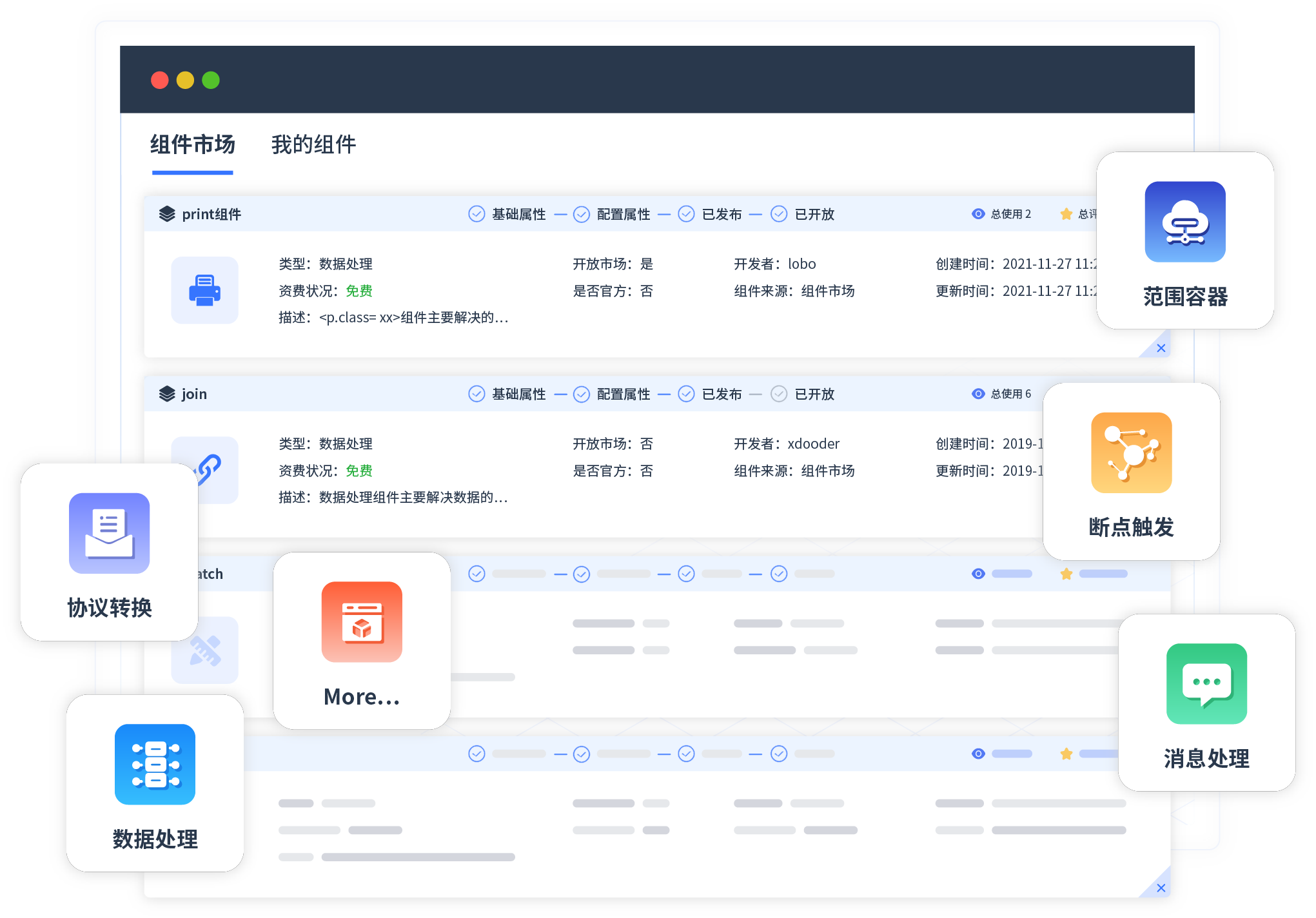针对集成场景,,,,GOPAY钱包提供组件市场,,,例如协议转换、、、消息处理、、、、文件操作等。。。。除平台提供的组件外,,客户可以自定义所需组件。。。。