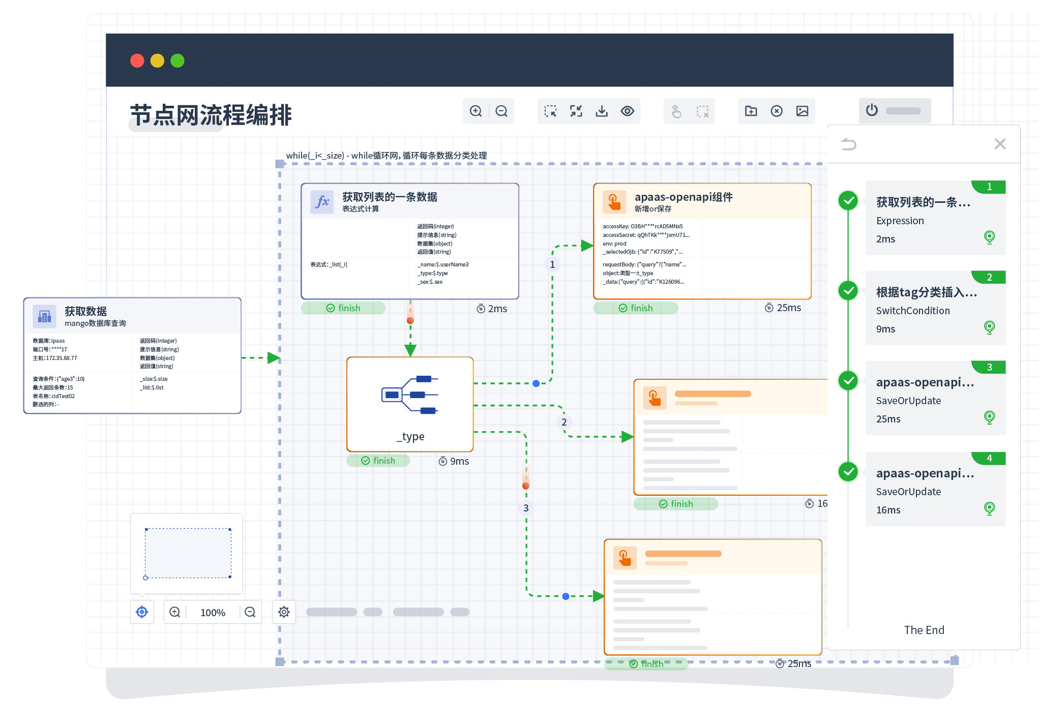 针对集成场景,,,,组件定义后支持进行流程编制,,,不同于传统代码方式,,,通过图形化展示,,,,支持在线调试、、日志查看和运行回放。。